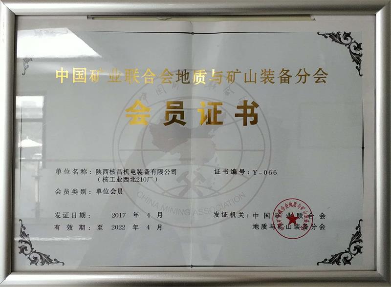 中國礦業聯合會地質與礦山裝備分會會員證書