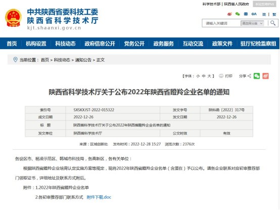 日前,陜西省科學(xué)技術(shù)廳公布了《陜西省科學(xué)技術(shù)廳關(guān)于公布2022年陜西省瞪羚企業(yè)名單的通知》(陜科函〔2022〕317號(hào)),根據(jù)陜西省瞪羚企業(yè)培育認(rèn)定實(shí)施方案等規(guī)定,經(jīng)屬地推薦、第三...