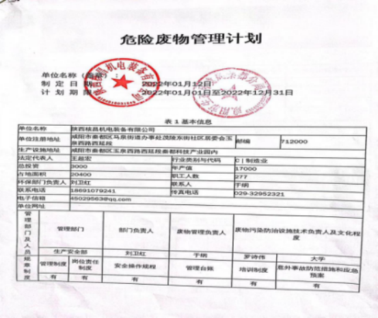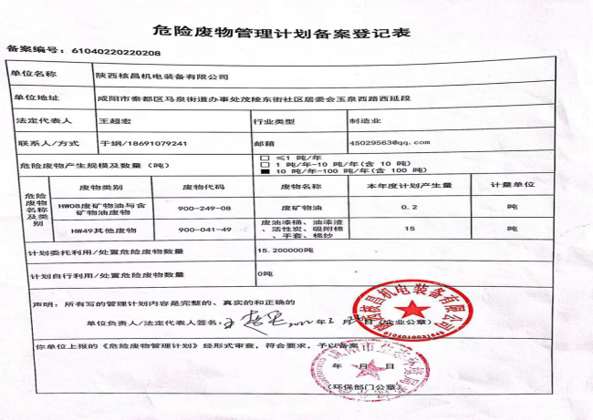 我公司屬機電一體化、機械加工等產(chǎn)業(yè)的生產(chǎn)及經(jīng)營活動, 現(xiàn)階段主要的危險廢物包括:油漆桶、廢機油、乳化液、噴漆、噴砂。油漆桶、廢機油、乳化液等危險廢物處置由陜西明瑞資源再生有限公司承接轉(zhuǎn)運及處理危廢;噴漆、噴砂房等由公司投入大量資金進行升級改造,在經(jīng)營活動中加強職工環(huán)保培訓,不斷提升職工環(huán)保意識。經(jīng)陜西格林秦灃環(huán)保科技有限公司監(jiān)測,所排廢氣均達到國家標準。為改善環(huán)境、大氣質(zhì)量作出積極的貢獻。